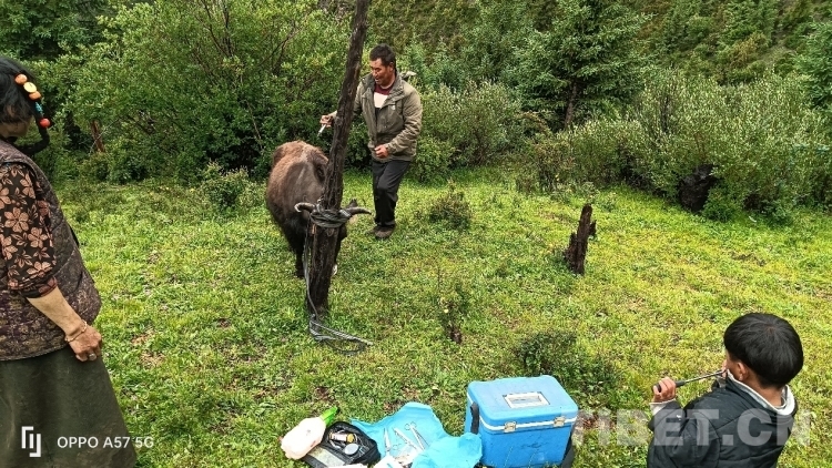 只見那頭受傷的牛被拴在木樁上,尾巴處還帶有一些血跡,顯得非常虛弱。索杰醫生先是把手術的傷口處仔細檢查了一遍,然后取來藥箱,在傷口處給藥,他告訴牧民家的男主人,牛恢復得還可以,不要太擔心,留下的藥是這幾天涂抹和口服的,要按時服用。