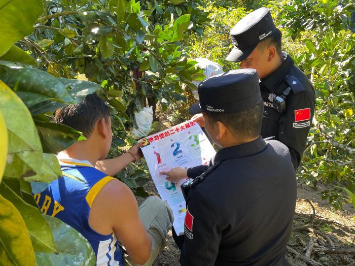 墨脫縣邊境派出所民警在墨脫鎮米日村蜜桔種植基地為群眾宣講黨的二十大精神。