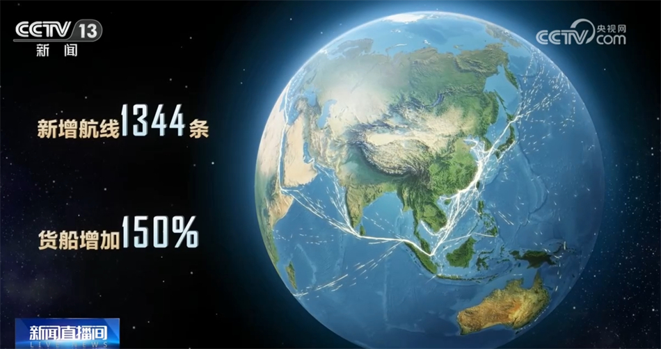 向大海,這是2013年時中國與共建“一帶一路”國家間的水運航線。十年間,共建“一帶一路”國家間的水運航線數(shù)量翻了一番,新增航線達到了1344條,穿梭其中的貨船增加150%。“絲路海運”航線已通達全球43個國家的117個港口,織出了一張聯(lián)通世界的貿(mào)易流動網(wǎng)絡(luò)。