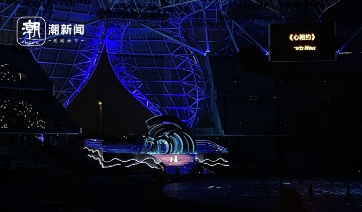 靜謐的夜色之下,如清泉叮咚的童稚之聲,如鳥兒展翅的手語動作,講述著桂花開時貴客盈門的喜悅,觀眾也隨之徜徉在一個個溢滿桂香的夢里。場上的朵朵桂花騰空而起,在空中匯聚成一個金桂花冠。