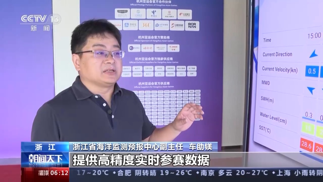 浙江省海洋監測預報中心副主任 車助鎂:這是未來三小時的海洋預報信息,流向、流速、平均波向、涌高、水位、水溫,這些信息將為亞運會帆船運動員提供高精度實時的參賽數據。