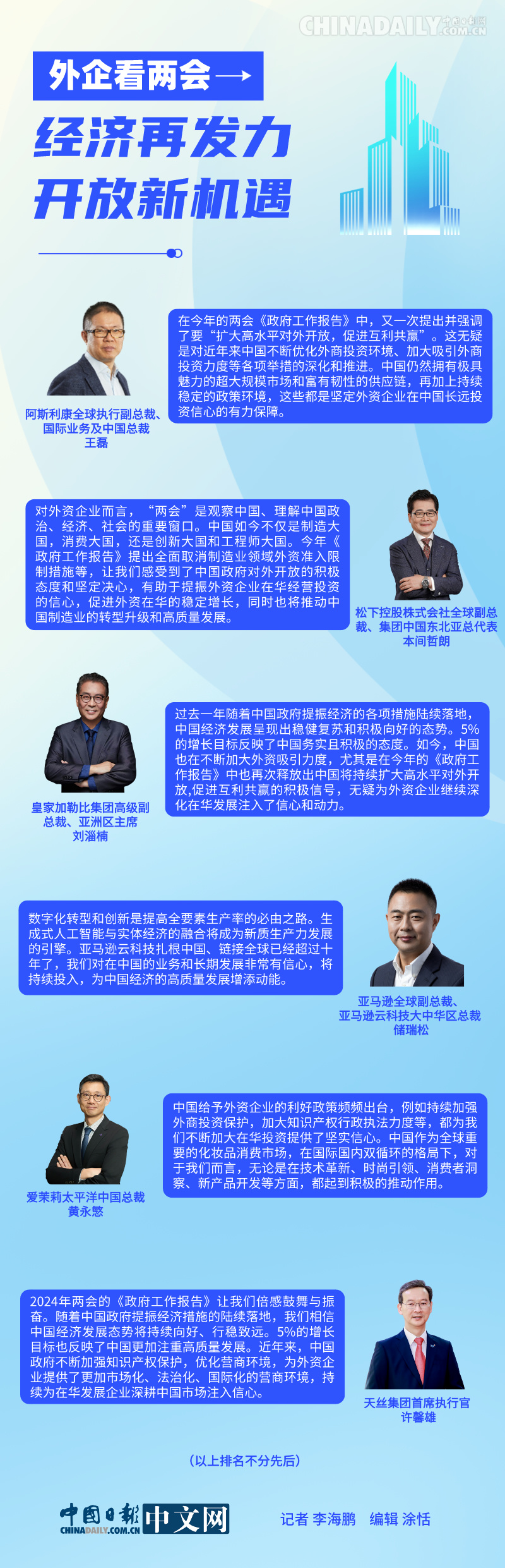 “中國是贏得未來的重要引擎”、“5%的經濟增長目標反映了中國理性務實的發展態度,同時也反映了中國更加注重高質量發展”、 “《政府工作報告》中再次釋放出中國將持續擴大高水平對外開放、促進互利共贏的積極信號,為外資企業繼續深化在華發展注入了信心和動力”、“與中國‘脫鉤’是不現實的,在經濟全球化時代,各國深化合作才能讓經濟可持續發展”……眾多外企紛紛表示,中國經濟的穩定發展將會繼續為外資企業提供廣闊的空間和豐富的機遇,于此同時,他們也將持續投入、加碼中國市場,為中國經濟高質量發展提供動力。