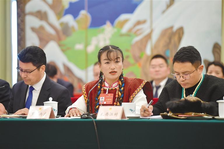 圖為3月6日上午,西藏代表團舉行全體會議,傳達學習習近平總書記在參加江蘇代表團審議時的重要講話精神,繼續審議政府工作報告 ,審查計劃報告和預算報告。圖為全國人大代表扎西尼瑪(中)在會上發言。