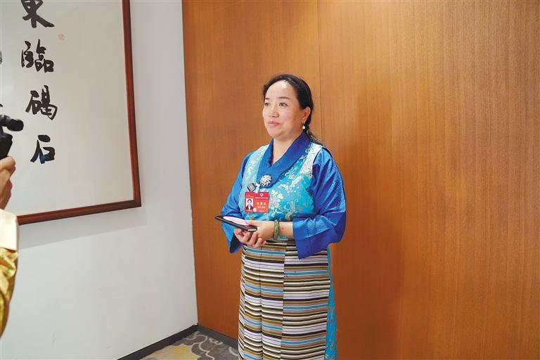 圖為會議間隙,住藏全國政協委員明吉措姆在接受媒體采訪。記者 張思雨 旦增旺姆 攝