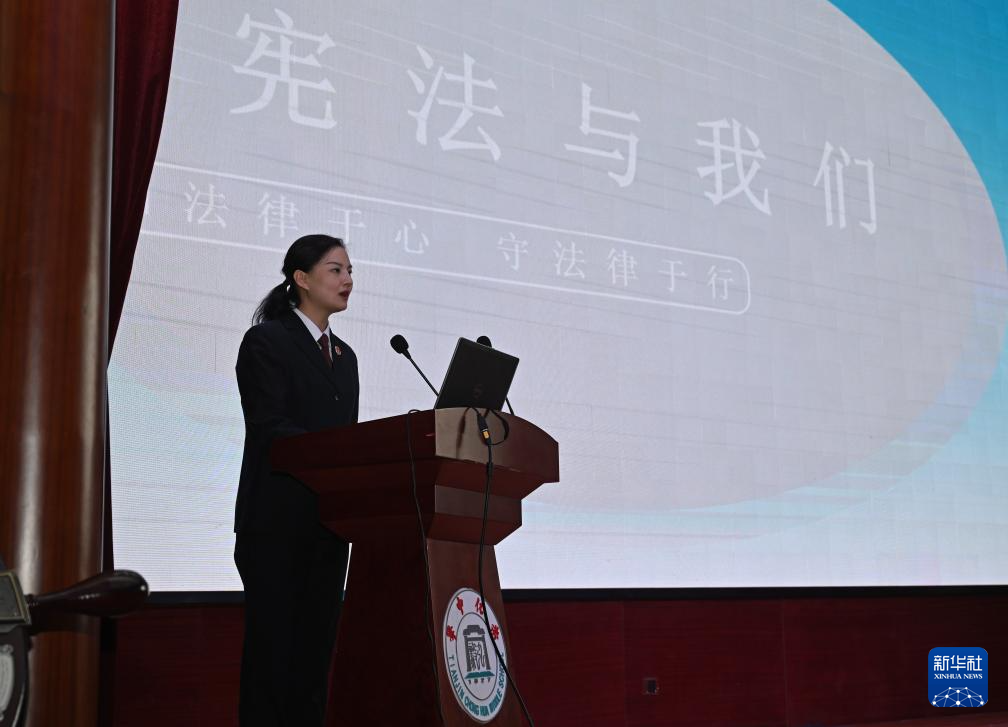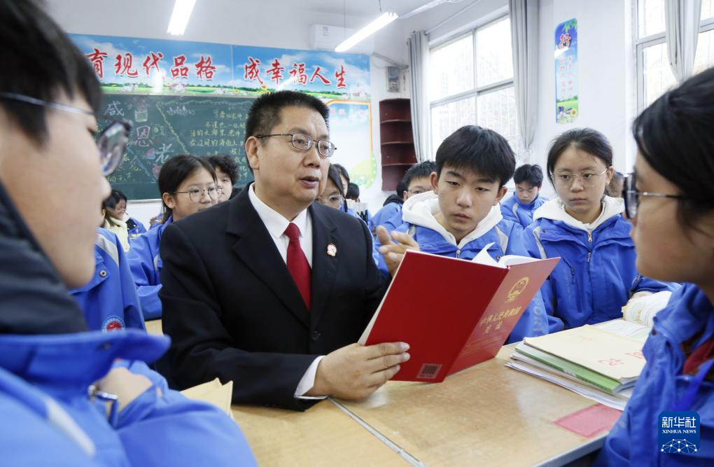 12月3日,河南省洛陽市汝陽縣人民法院法官為縣直屬初級中學學生講解新中國憲法發展歷程。