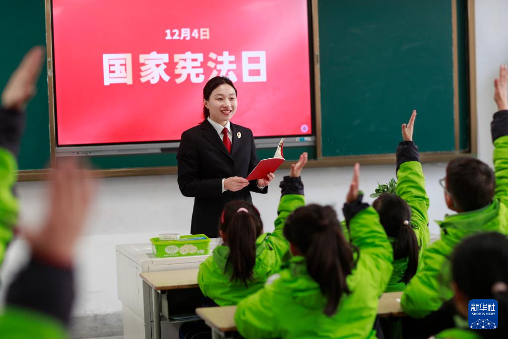 12月3日,在四川省達州市通川區羅江鎮魏興實驗學校,普法志愿者給學生講解憲法知識。