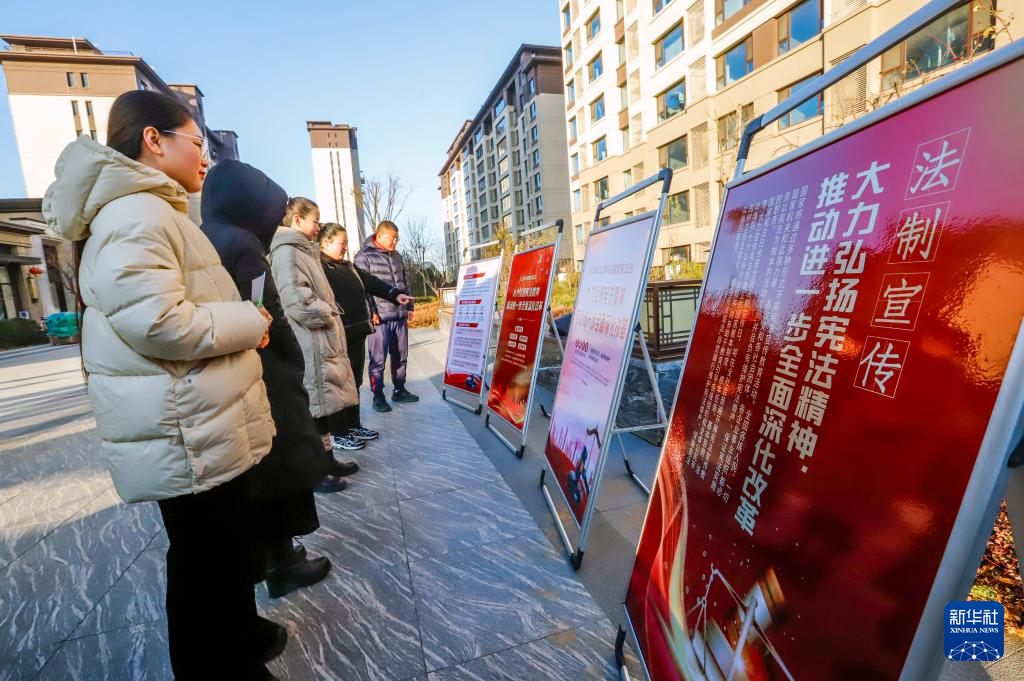 12月3日,河北省遵化市華明路街道的社區居民在參觀憲法知識宣傳展板。