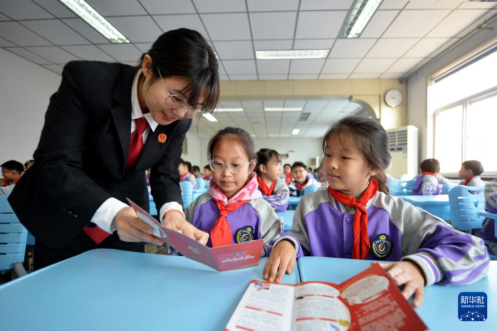 12月3日,在山東青島壽光路小學開展的憲法知識進校園活動上,法官在指導學生學習憲法知識。