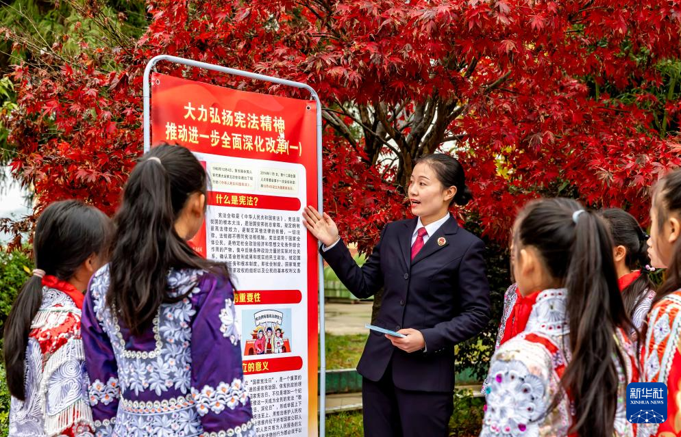 12月3日,貴州省黔西市人民檢察院的檢察干警在新仁苗族鄉化竹小學為學生普及憲法知識。