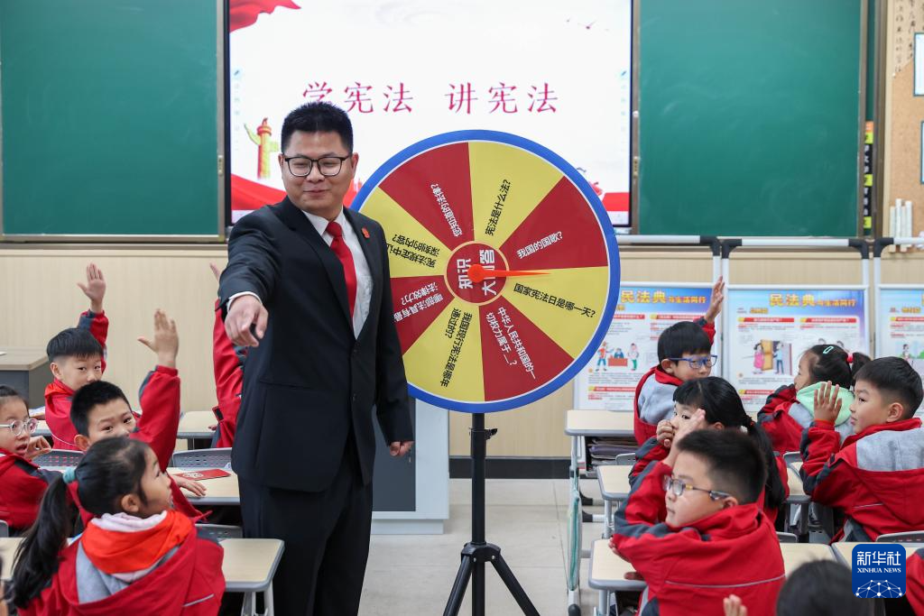 12月3日,在浙江省湖州市德清縣雷甸鎮中心小學,德清縣人民法院雷甸人民法庭工作人員通過知識大轉盤為學生普及憲法知識。