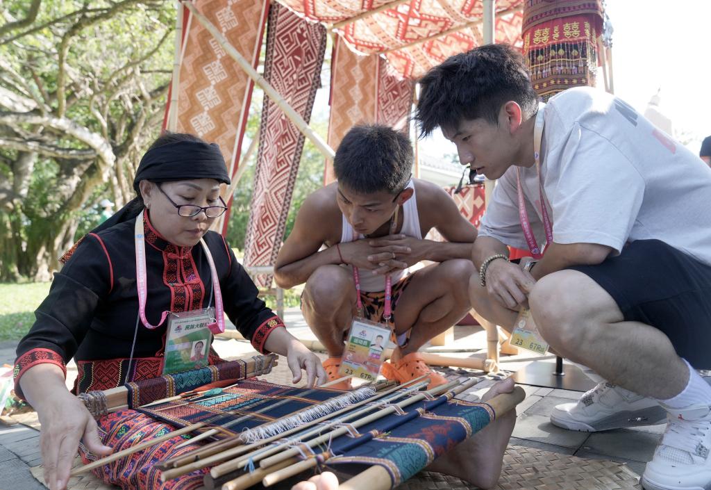 11月26日,演員(左)在活動中為代表團成員展示黎族傳統紡染織秀技藝。當日,第十二屆全國少數民族傳統體育運動會民族大聯歡活動在海南省三亞市舉行。新華社記者 胡超 攝