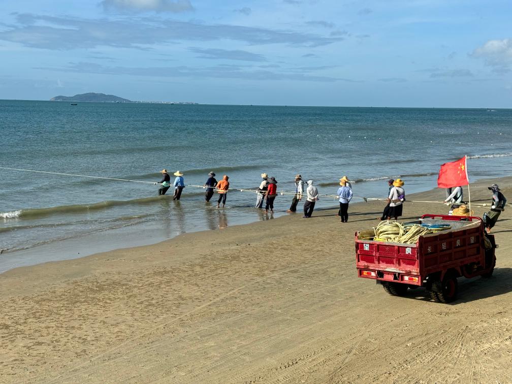 清晨的三亞灣,漁民們正赤腳在沙灘上與大海進行“拔河”——這是當地漁民收網捕魚的獨特景象,他們要在兩小時內收起上千米長的漁網。漁民們期待贏下這場與大海的較量,從而得到豐厚的漁獲。