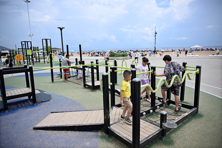 8月14日,小朋友在青島嶗山區石老人海水浴場健身游樂區玩耍。新華社記者 李紫恒 攝
