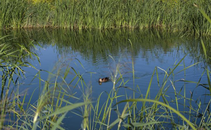 這是8月10日拍攝的位于寧夏吳忠市利通區的古城灣人工濕地內的野鴨(無人機照片)。新華社記者 任瑋 攝