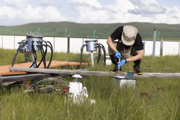 7月25日,科研人員在若爾蓋日干喬濕地一處試驗平臺采取氣體樣本。新華社記者 金立旺 攝