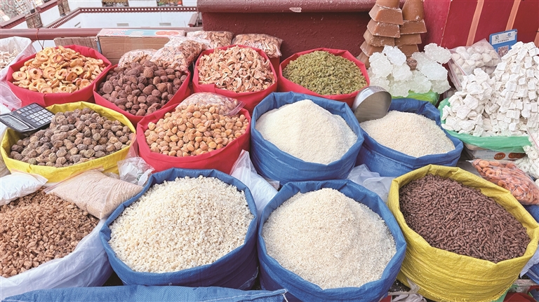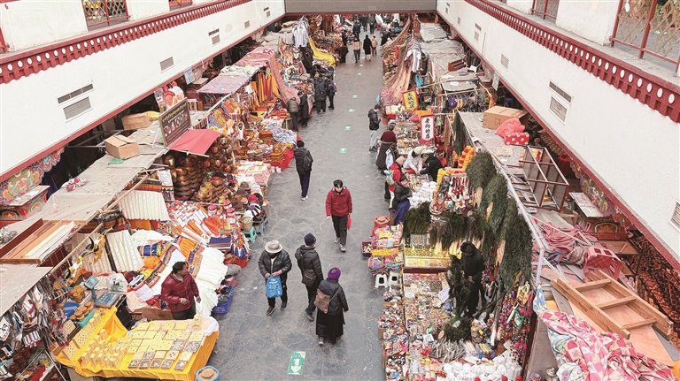 頓珠則在攤位前挑選了一款極具當地特色的門簾。“冬天天氣冷,又趕上藏歷新年快到了,掛上門簾既能擋風保暖,又能增添節日氛圍。” 頓珠說,八廓商城的一站式采購太方便了,吃的、喝的、穿的、用的一應俱全,不用東奔西跑,省了不少時間和精力。