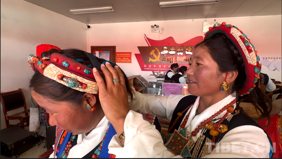 身著傳統服飾的曲堆“諧欽”隊演職人員在整理配飾