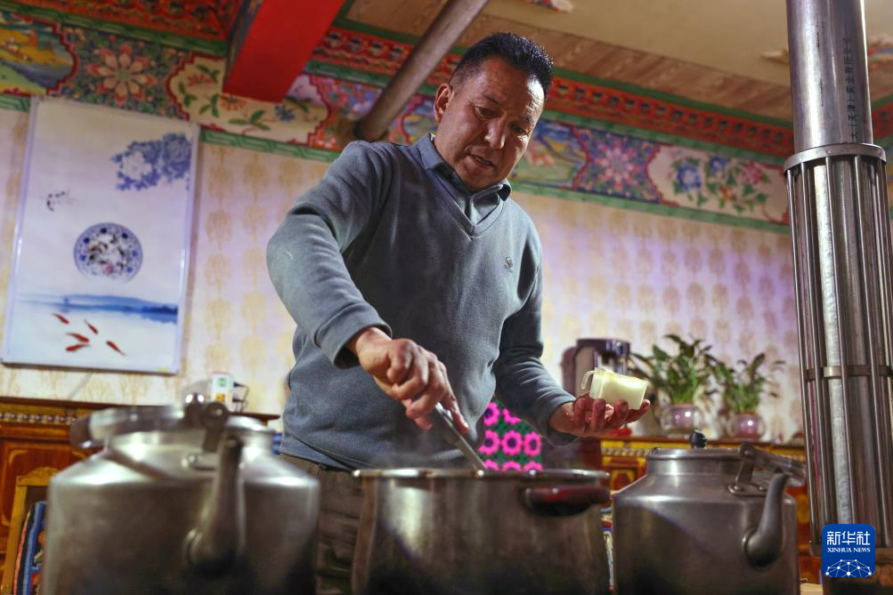 2月16日,在拉薩堆龍德慶區東嘎街道桑木社區,群群在攪拌“古突”。新華社記者 丁增尼達 攝