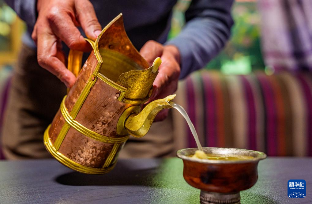 2月16日,在拉薩堆龍德慶區東嘎街道桑木社區,群群在倒青稞酒。新華社記者 丁增尼達 攝