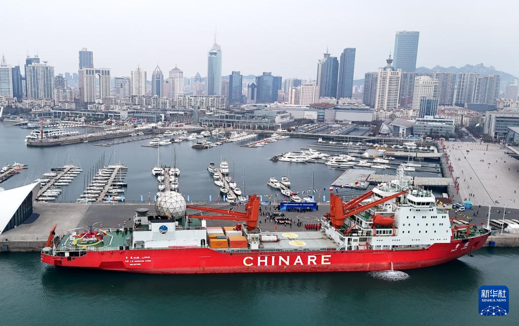 “雪龍”號極地考察船停靠青島奧帆基地碼頭(4月10日攝,無人機照片)。
