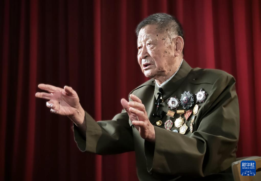 黃宗德接受采訪時講述自己的戰斗經歷(2024年9月10日攝)。新華社發(靳憲彬 攝)