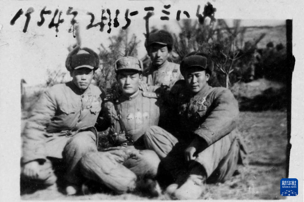 黃宗德(右一)與戰友在朝鮮合影留念(1954年2月15日攝)。新華社發