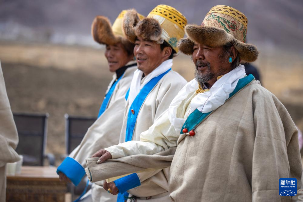 作為村中長者,尼瑪(左)在春耕儀式上接受敬酒(3月16日攝)。新華社記者 姜帆 攝