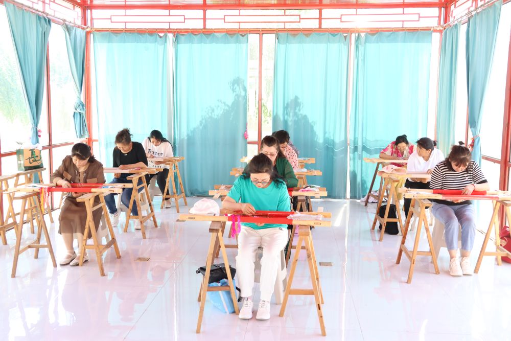 在內蒙古自治區科爾沁右翼中旗蒙古族刺繡產業園車間內,由蒙古族、漢族、朝鮮族、達斡爾族繡工們坐在繡花撐子前各顯身手。