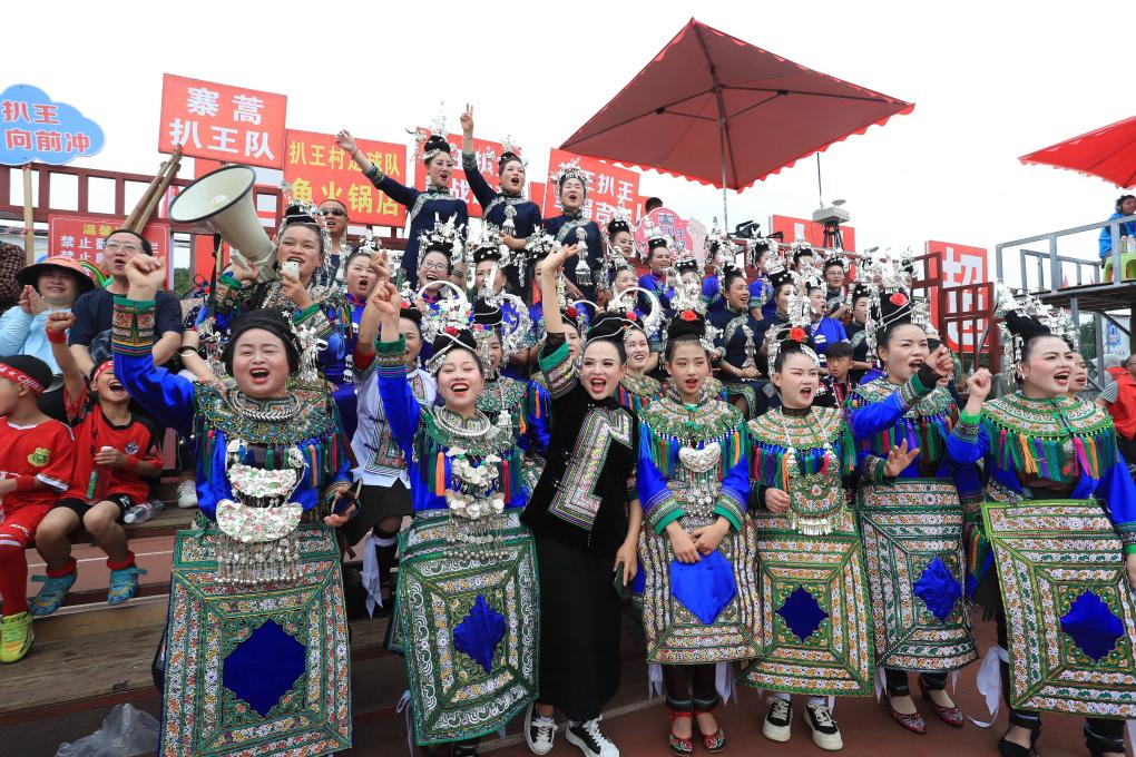 2024年5月4日,在貴州省黔東南苗族侗族自治州榕江縣“村超”球場,當(dāng)?shù)厝罕娚碇⒀b為本村球隊(duì)加油鼓勁。新華社發(fā)(楊成利 攝)