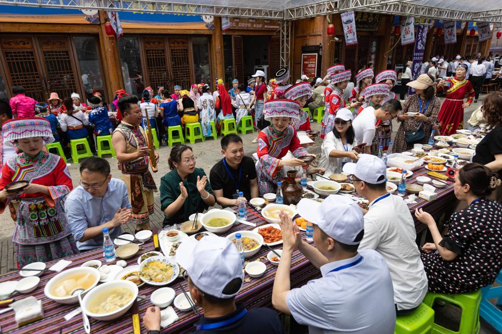 2023年4月20日,在四川省興文縣市民廣場舉行的四川省級非遺“興文苗族花山節(jié)”展示傳承活動(dòng)上,嘉賓和游客體驗(yàn)苗家長桌美食宴。新華社記者 江宏景 攝