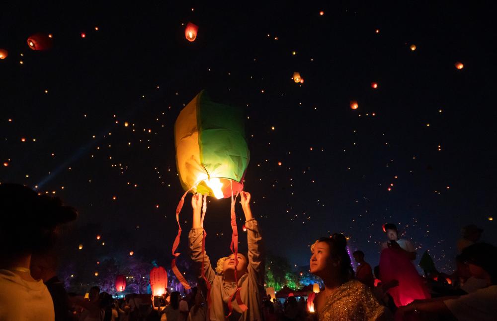 2023年4月13日晚,游客在云南省景洪市瀾滄江邊放飛孔明燈祈福許愿,慶祝傣歷新年。新華社記者 江文耀 攝