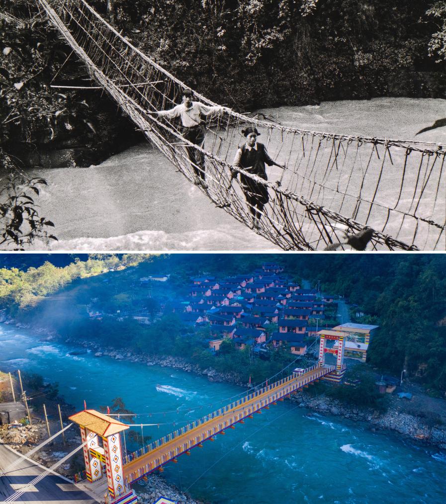 拼版照片:上圖為獨(dú)龍族群眾通過藤蔑橋(資料照片);下圖為獨(dú)龍江鄉(xiāng)白來感恩大橋(2020年10月29日攝,無人機(jī)照片,新華社記者胡超攝)。獨(dú)龍族是我國28個(gè)人口較少的民族之一,也是新中國成立初期從原始社會直接過渡到社會主義社會的少數(shù)民族,主要聚居在云南貢山獨(dú)龍族怒族自治縣獨(dú)龍江鄉(xiāng)。近年來,國家有關(guān)部門和云南省以整體推進(jìn)的思路對獨(dú)龍江鄉(xiāng)進(jìn)行集中幫扶,加速消除基礎(chǔ)設(shè)施、產(chǎn)業(yè)發(fā)展、人才素質(zhì)等“瓶頸”問題,使當(dāng)?shù)亟?jīng)濟(jì)社會實(shí)現(xiàn)跨越式發(fā)展。2018年,獨(dú)龍族整族脫貧,實(shí)現(xiàn)“千年跨越”。