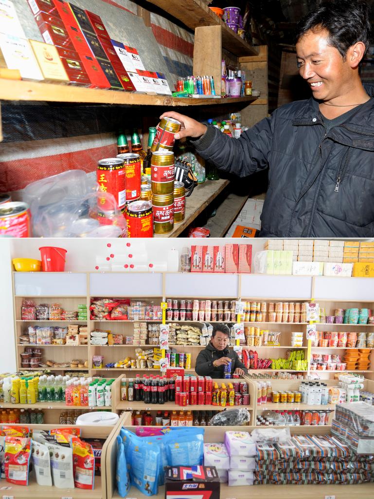 拼版照片:上圖為玉麥鄉(xiāng)一家商店的店主次旦扎西在擺放商品(新華社記者普布扎西攝,2009年9月9日攝);下圖為玉麥鄉(xiāng)一家超市的工作人員白瑪旺堆在店內(nèi)整理商品(新華社記者丁汀攝,2024年10月15日攝)。西藏自治區(qū)山南市隆子縣玉麥鄉(xiāng)地處喜馬拉雅山脈南麓。受惡劣自然條件影響,這里一度只有桑杰曲巴和女兒卓嘎、央宗三人居住,牢牢守在祖國邊境線上,這里也曾被稱為“三人鄉(xiāng)”。如今,曾經(jīng)的“三人鄉(xiāng)”已經(jīng)發(fā)展到67戶200多人,變成下轄兩個(gè)行政村的“小康鄉(xiāng)”。學(xué)校、衛(wèi)生院、游客接待中心等建筑物在這里拔地而起,不少村民用自家房屋開起了家庭旅館、小賣部、快遞站等……2023年,玉麥全鄉(xiāng)人均年收入超4萬元,人均居住面積達(dá)40平方米。如今的玉麥,迎來了“蝶變”。