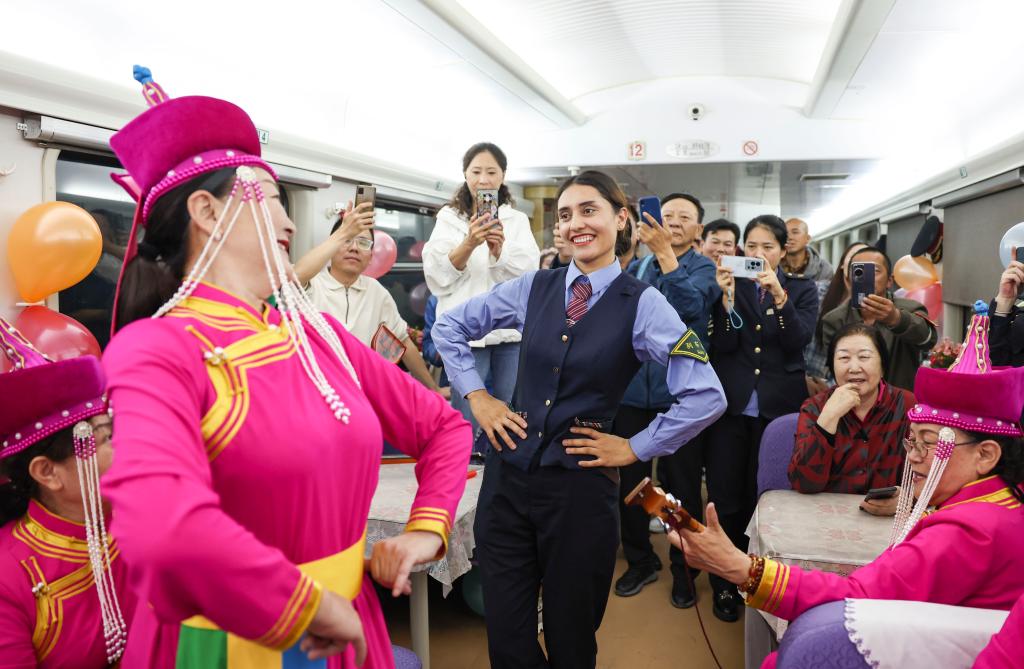 在由喀什開往成都西的列車上,塔吉克族列車長艾爾開牙·多力開與民間藝人一起跳舞(2024年4月19日攝)。回憶入職經(jīng)歷,艾爾開牙·多力開說:“這是一次幸福的機(jī)遇。”2019年,為助力脫貧攻堅(jiān),鐵路部門在新疆喀什、和田等地招錄1000多名應(yīng)屆畢業(yè)生。剛走出大學(xué)校門的艾爾開牙·多力開抱著試一試的心態(tài),帶著對遠(yuǎn)方的憧憬,與鐵路結(jié)緣。在擔(dān)任列車員的四年時(shí)間里,艾爾開牙·多力開一步步成長,工作出勤、作業(yè)規(guī)范等考核都名列前茅。2023年下半年,她以優(yōu)異成績通過系列綜合測評,成為我國首位塔吉克族列車長。新華社記者 胡虎虎 攝