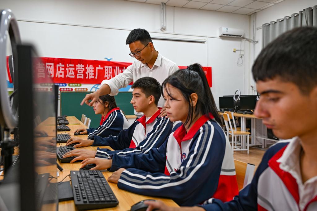 2024年9月10日,在阿拉爾職業(yè)技術(shù)學(xué)校,李斌傲在實(shí)訓(xùn)室指導(dǎo)學(xué)生。“95后”年輕教師李斌傲是第十一批浙江臺州到新疆阿拉爾職業(yè)技術(shù)學(xué)校援疆教師中的一員。2023年2月,李斌傲前往阿拉爾任教。一年半任期結(jié)束后,他沒有選擇回到臺州,而是申請留下來,在阿拉爾繼續(xù)播撒知識的種子。新華社記者 陳朔 攝