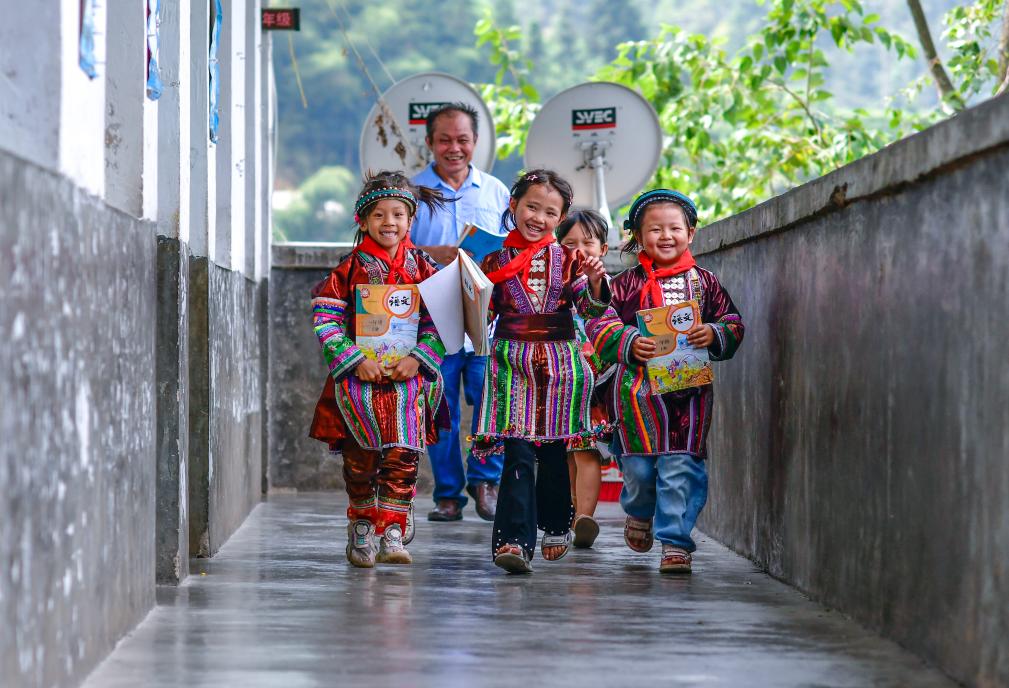 貴州省黔東南苗族侗族自治州從江縣西山鎮(zhèn)的中寨教學(xué)點(diǎn),教師孟榮達(dá)(后)與學(xué)生們在下課后走出教室(2024年9月6日攝)。新華社記者 楊文斌 攝