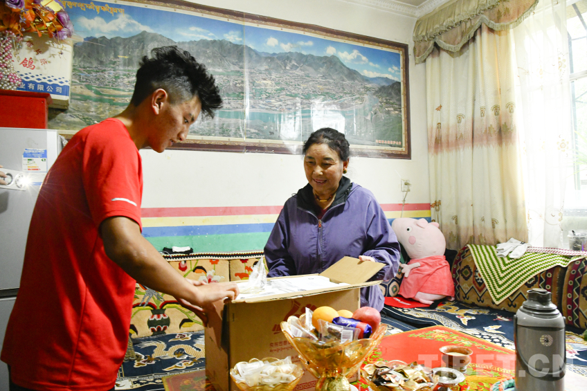 圖為卓嘎與兒子羅布次仁一起鄭重打開(kāi)中央代表團(tuán)贈(zèng)送的全自動(dòng)酥油茶壺包裝 攝影:趙振宇