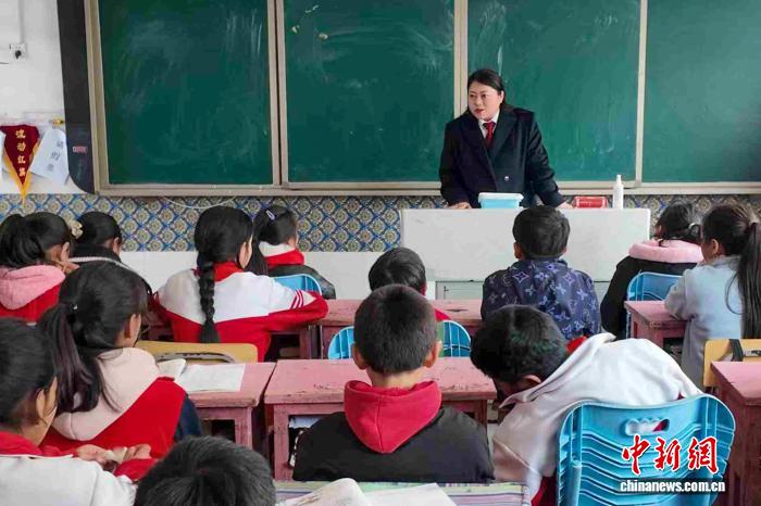 圖為2025年4月,全國政協委員、西藏墨脫縣人民法院綜合審判庭庭長白瑪玉珍在墨脫縣格當鄉小學為孩子們上法治課。(受訪者供圖)