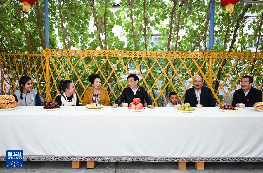 9月25日下午,受習近平總書記囑托,中共中央政治局常委、全國政協主席、中央代表團團長王滬寧帶領中央代表團部分成員在巴音郭楞蒙古自治州庫爾勒市看望慰問當地各族干部群眾。這是王滬寧和中央代表團部分成員在庫爾勒市阿瓦提鄉吾夏克鐵熱克村了解鄉村產業發展和群眾生產生活情況。新華社記者 張領 攝