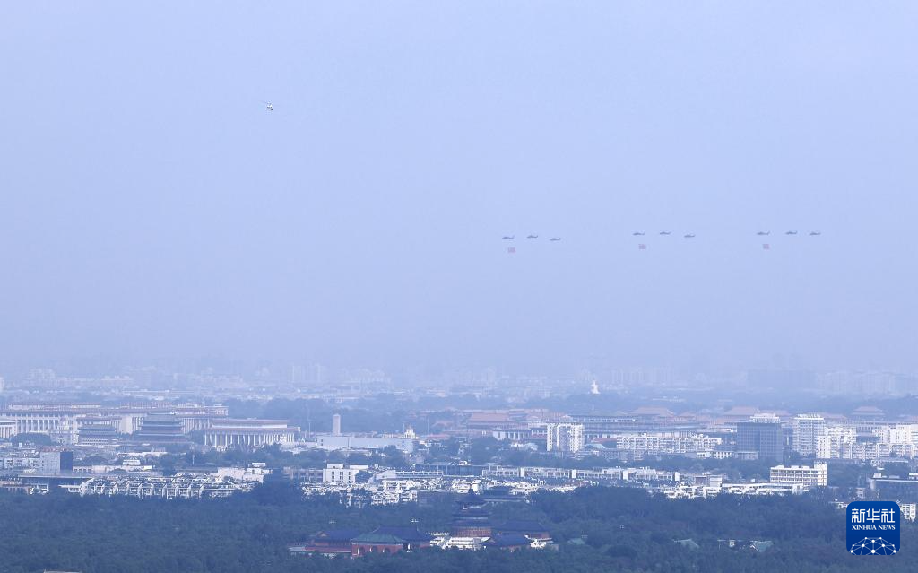 9月3日,紀(jì)念中國人民抗日戰(zhàn)爭暨世界反法西斯戰(zhàn)爭勝利80周年大會(huì)在北京隆重舉行。這是空中護(hù)旗梯隊(duì)。