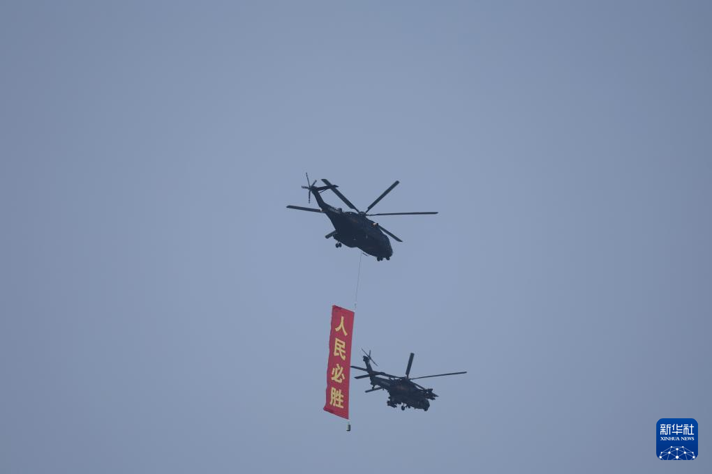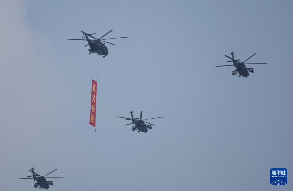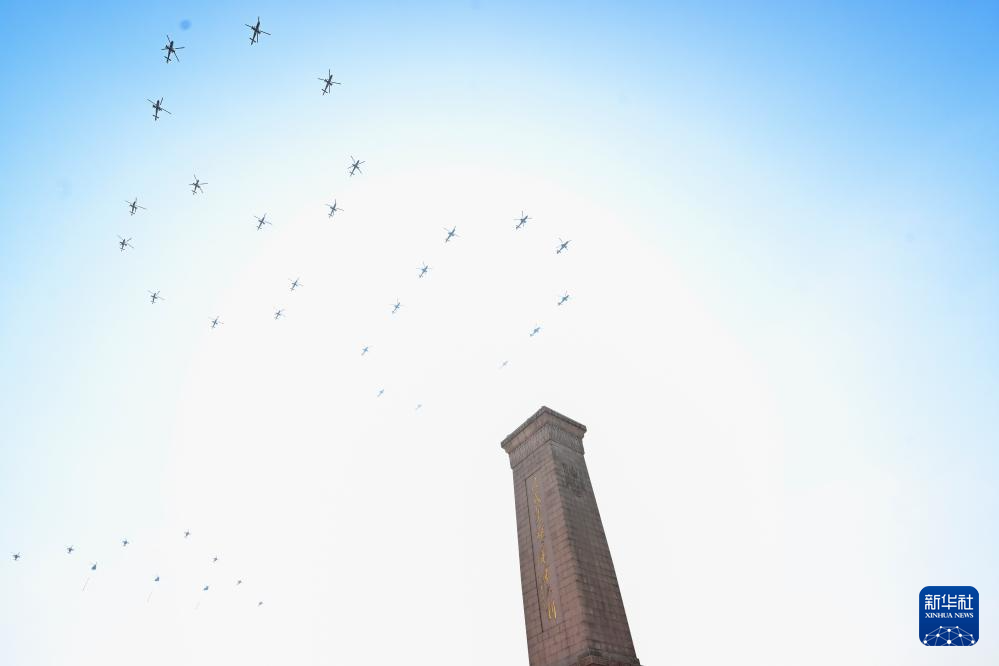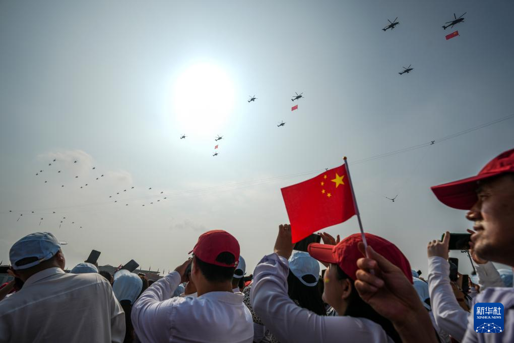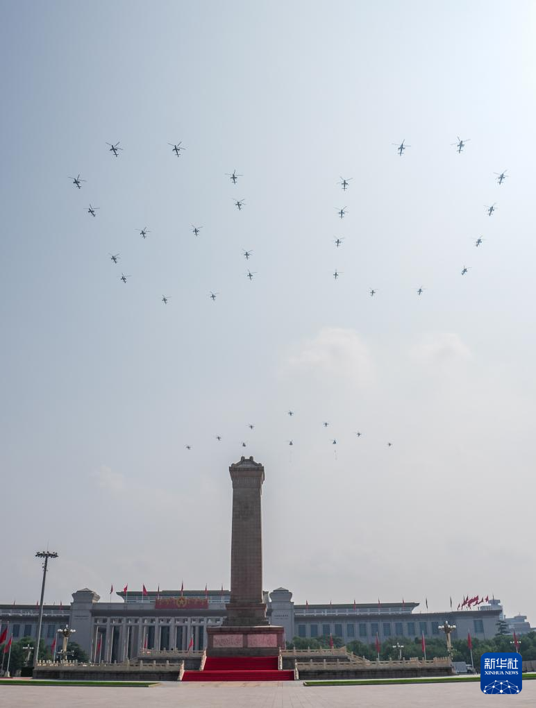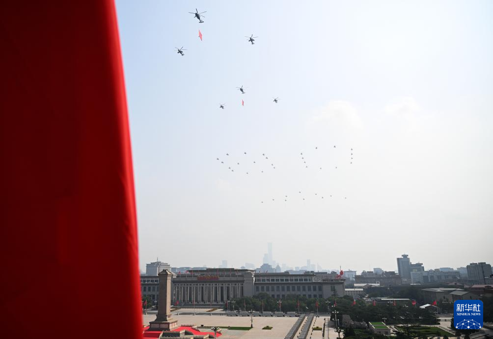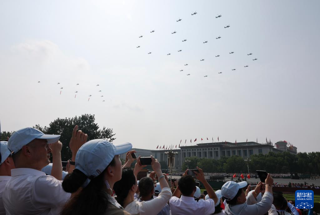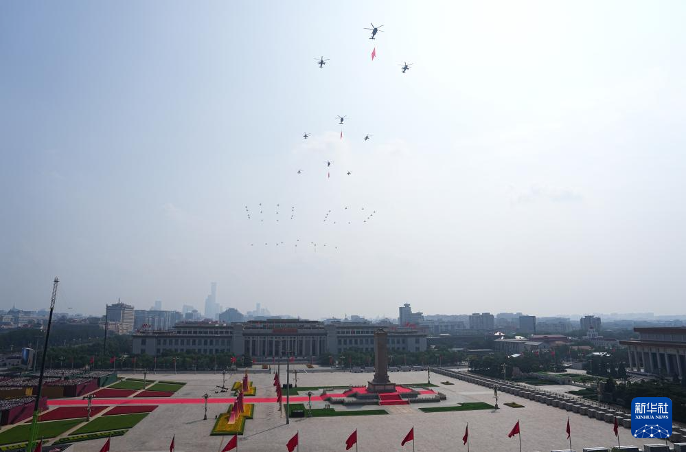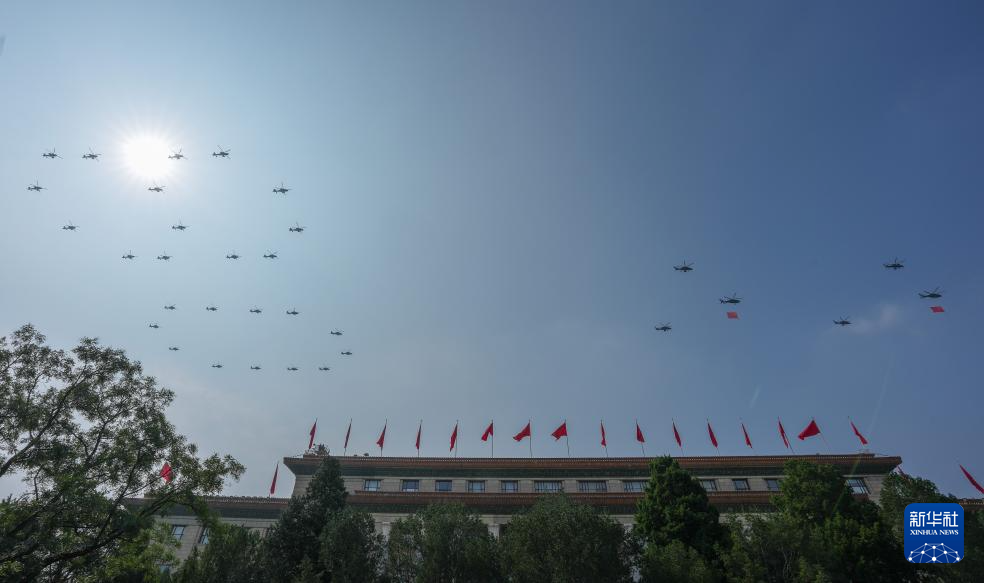 9月3日,紀(jì)念中國人民抗日戰(zhàn)爭暨世界反法西斯戰(zhàn)爭勝利80周年大會(huì)在北京隆重舉行。這是空中護(hù)旗梯隊(duì)飛過天安門廣場(chǎng)上空,26架直升機(jī)匯成巨大的“80”字樣。