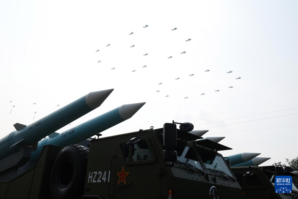 9月3日,紀(jì)念中國人民抗日戰(zhàn)爭暨世界反法西斯戰(zhàn)爭勝利80周年大會(huì)在北京隆重舉行。這是空中護(hù)旗梯隊(duì)從反艦導(dǎo)彈方隊(duì)上空飛過。