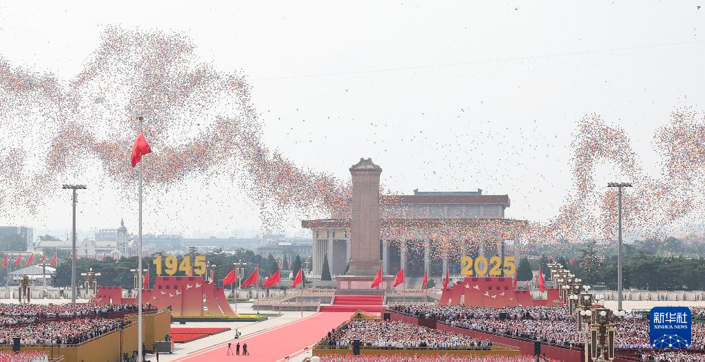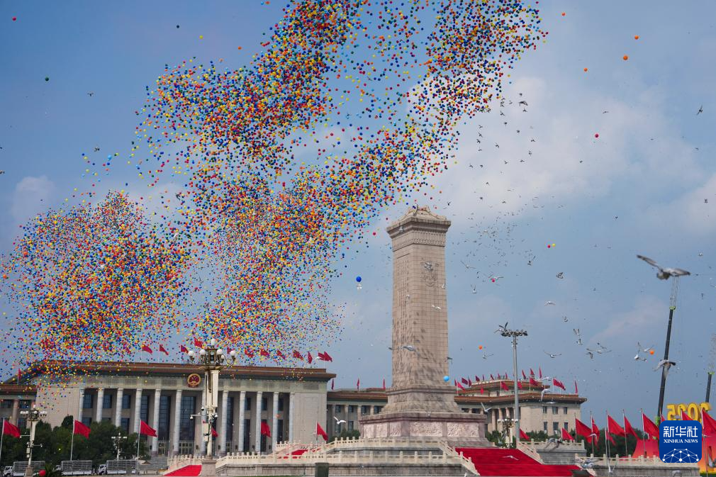 9月3日,紀念中國人民抗日戰爭暨世界反法西斯戰爭勝利80周年大會在北京隆重舉行。這是紀念大會現場放飛氣球。