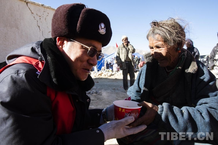 圖為在定日縣曲洛鄉措昂村受災安置點,剛剛換崗的公安民警將自己手中的早飯送到受災群眾的手中(攝于2025年1月9日) 攝影:趙振宇
