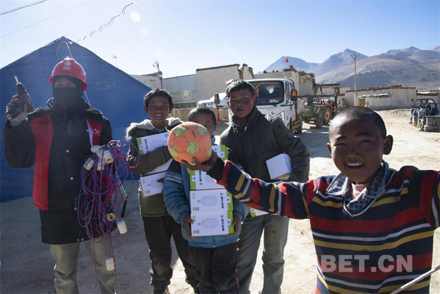 圖為地震發生第三日,在定日縣曲洛鄉措昂村國家電網工作人員為受災群眾安置點通電,孩子們開心地加入工作人員的隊伍中隨時搭把手(攝于2025年1月9日) 攝影:趙振宇