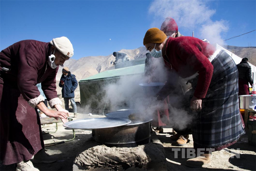 圖為震后第一個藏歷新年古突夜,在定日縣長所鄉茶江村受災群眾安置點里,村民扎西正在盛出熱氣騰騰的“古突”(攝于2025年2月27日) 攝影:趙振宇