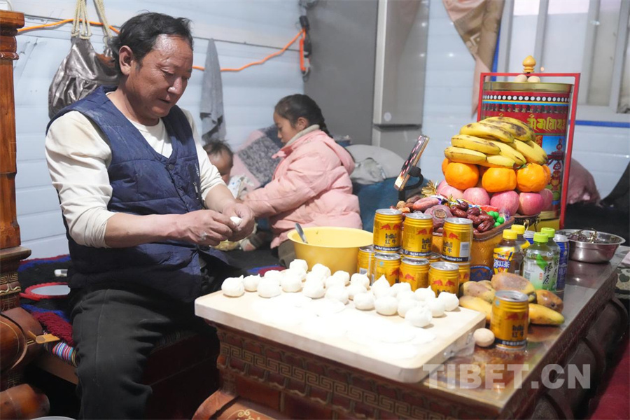 圖為震后的第一個節日“日喀則農事新年”。這一天恰逢日喀則農事新年古突夜與農歷春節除夕相遇在同一日。在定日縣曲洛鄉措昂村安置點內,拉華一家正在包藏式餃子慶祝這一天(攝于2025年1月28日) 攝影:旦曲