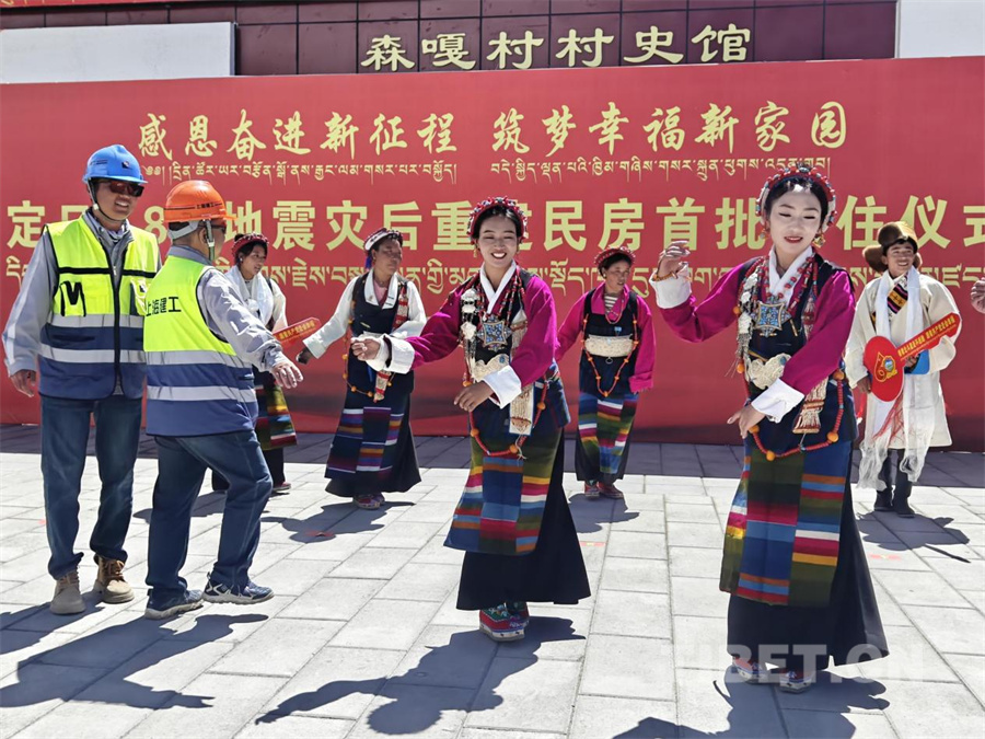 圖為西藏定日6.8級地震災后重建民房首批入住儀式現場,當地群眾與施工隊員載歌載舞,歡慶喬遷新居 (攝于2025年8月15日)攝影:次旦拉姆