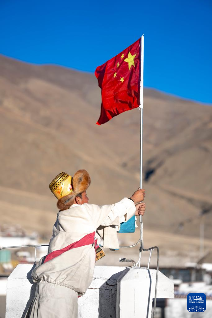 2月16日,長所鄉古榮村村民桑杰將一面嶄新的五星紅旗立在新居屋頂。新華社記者 旦增尼瑪曲珠 攝