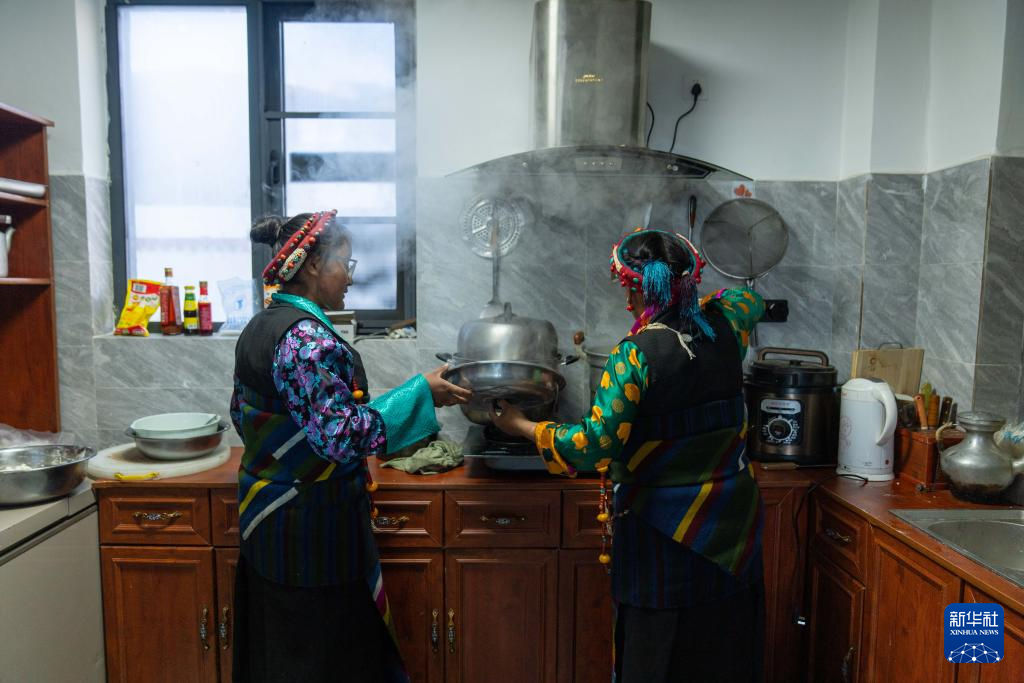 2月16日,長所鄉古榮村村民卓瑪次仁在新居廚房制作年節食品“古突”。在藏語中,“古”意為“九”,“突”意為“面”,“古突”是一種用牦牛肉湯加入牛肉、蘿卜、奶渣等食材熬煮的面食。按西藏傳統習俗,“古突”夜,家家戶戶迎來團聚,一起享用“古突”。新華社記者 旦增尼瑪曲珠 攝